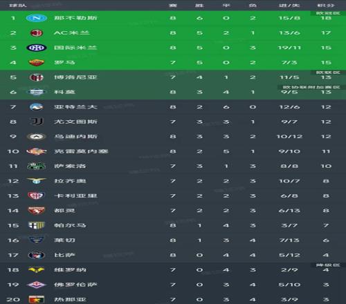 北京时间10月26日,意甲第8轮结束了5场比赛,最新积分榜如下!