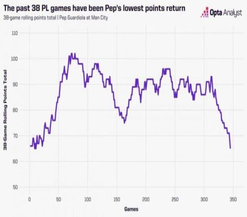 而数据统计显示,曼城在最近38轮英超联赛仅获得65分。