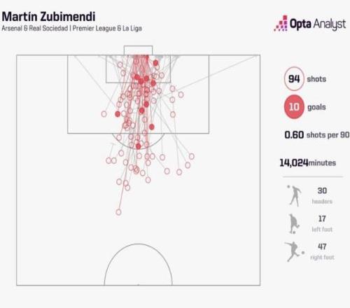 据统计,这是苏维门迪在顶级联赛生涯首次打进禁区外的远射,他在为皇家社会和阿森纳效力的比赛中94次射门打进10球,但是首次打进远射。