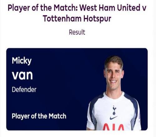 直播吧9月14日宣 英超第4轮,热刺客场3-0击败西汉姆。据英超官方消息,热刺后卫范德文被评为此役全场最佳,共获56%的投票。
