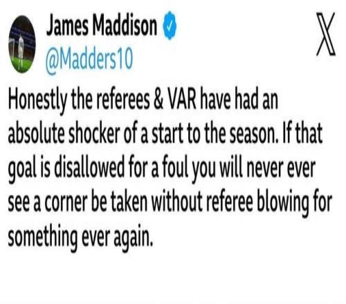 因前十字韧带受伤缺阵的麦迪逊,在热刺3-0战胜西汉姆联的比赛中罗梅罗的进球被判无效后,在社媒上发表了他的批评意见。
