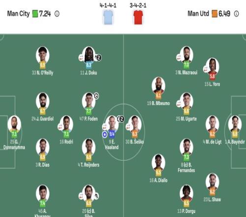 曼城(4141):25-多纳鲁马;45-胡桑诺夫,3-迪亚斯,24-格瓦迪奥尔,33-奥莱利;16-罗德里(76’14-尼科);20-B席(88’6-阿克),4-赖因德斯,47-福登,10-多库(77’26-萨维尼奥);9-哈兰德(87’52-鲍勃)