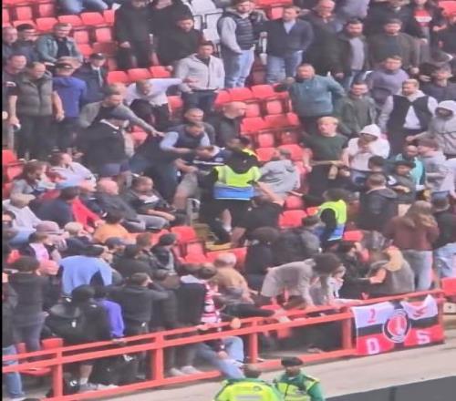 从视频画面中可以看到,不知是喝多了酒后的无意识举动还是有意为之,这名球迷不仅大摇大摆地穿着米尔沃尔球衣坐在查尔顿的主场看台,还在比赛尾声庆祝米尔沃尔的扳平进球,甚至亲吻队徽挑衅,引发了周围主队球迷的强烈不满。有人试图冲过去动手,在他转身时甚至有人从背后飞踢。随后他还被人推下楼梯,过程中还有杂物被砸向他。