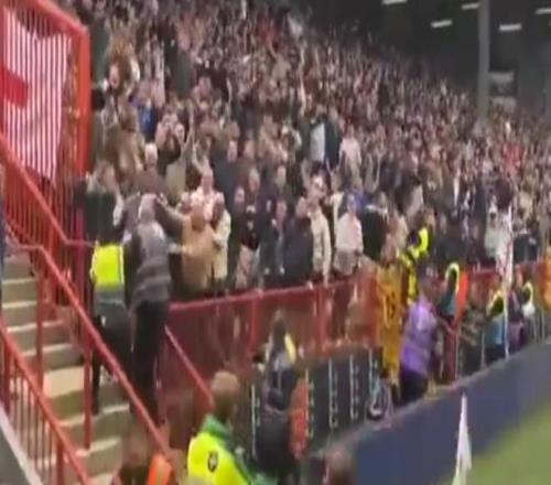 据悉,在米尔沃尔队88分钟打入绝平球后,这位老哥一激动就想翻栏杆闯进客队看台,结果客队球迷误以为他是来挑衅的主队球迷,直接一拳招呼过去。而这位老哥被打以后显然也有点懵,随后他转向另一侧看台试图再次翻越,但又被米尔沃尔远征军当成了来挑衅的主队球迷殴打。好在随后安保及时赶到将他保护了起来。