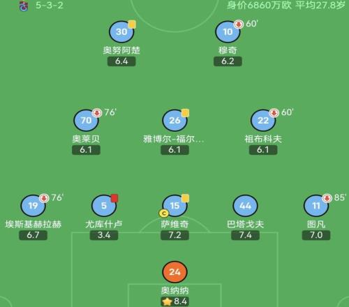 特拉布宗体育在少一人作战的情况下,只是1球小负费内巴切,球队门将奥纳纳起到了很大作用。奥纳纳本场完成8次扑救,获评8.4分,为全场最高分,奥纳纳尽力了,幸好他有给力的表现,要不然特拉布宗体育将吃到一场惨败。离开曼联后,奥纳纳的风评有了改善。