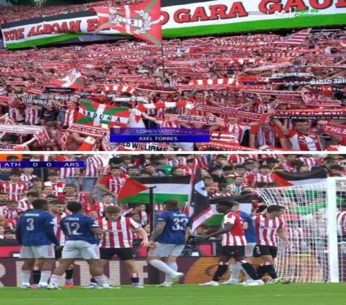 有西班牙记者晒出本场比赛毕尔巴鄂的球迷看台,可以见到许多支持巴勒斯坦的助威旗帜和横幅。