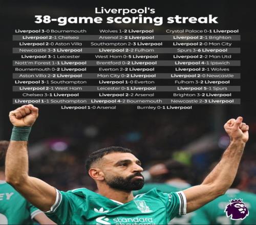 根据英超官方统计,利物浦连续38场联赛取得进球。