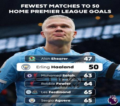 英超官方统计,哈兰德在曼彻斯特德比中完成自己英超生涯的第50个主场进球。