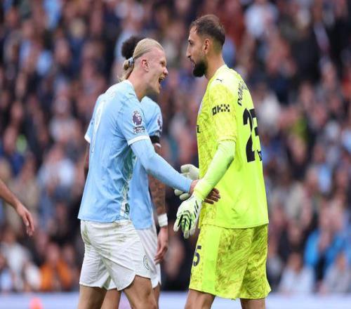 当多纳鲁马在曼市德比完成那记让所有质疑者闭嘴的扑救时,哈兰德冲上去与之庆祝。这位身材魁梧的前锋用一个凶猛的胸部撞击迎接了他同样高大的队友门将。
