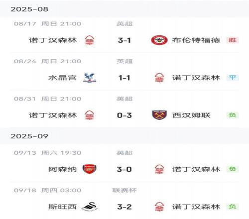 这是诺丁汉森林各项赛事遭遇的连续第3场失利,他们至今的5场比赛仅在英超首轮赢下布伦特福德,如今更是在联赛杯被英冠队斯旺西淘汰,遭遇各项赛事4场不胜。