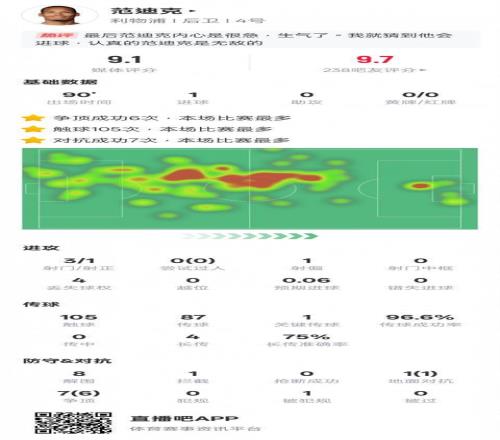 直播吧9月18日宣 欧冠联赛阶段第1轮,利物浦3-2马竞。范迪克首发出战,贡献绝杀,105次触球全场最多,7次对抗成功也是全场最多,还有1次关键传球和8次解围,评分9.1。