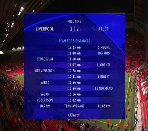 直播吧9月18日宣 欧冠联赛阶段第一轮比赛,利物浦主场3-2击败马竞,本场比赛朱利亚诺-西蒙尼跑动12.23公里全场最多。