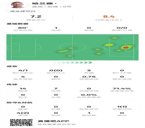 直播吧9月19日宣 欧冠联赛阶段第1轮,曼城对阵那不勒斯,哈兰德首发出战,4次射门1次射正,打进1球,评分7.2。