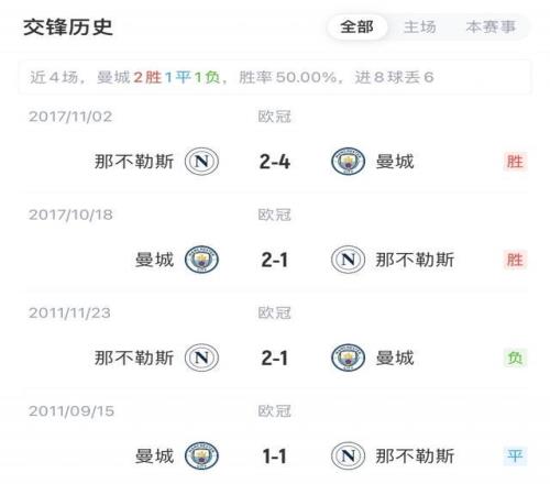 曼城开季联赛2胜2负积6分暂位英超第8,上一场主场3-0战胜曼联;那不勒斯开季3战全胜积9分,暂位意甲榜首。双方交锋曼城已取得两连胜。