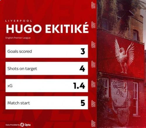 据媒体统计,埃基蒂克英超开局5场比赛皆首发出战,射正4次,预期进球1.4粒,打进3球。