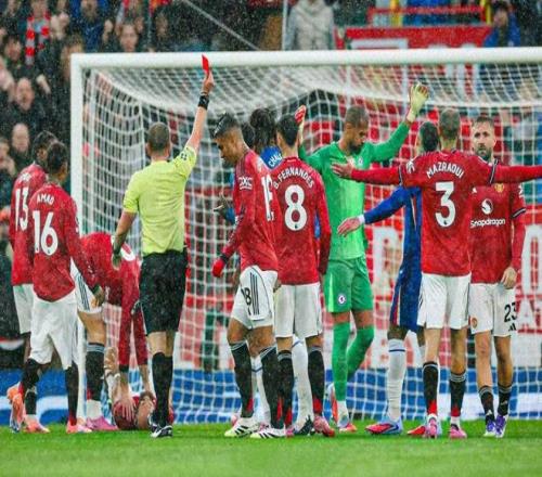 第36分钟,曼联利用角球的机会,造成禁区混乱,卢克肖头球摆渡,卡塞米罗插上头球破门,2:0!但是没想到,上半场补时的第5分钟,卡塞米罗吃到第二张黄牌,两黄变一红也被罚下!场面形成10打10。