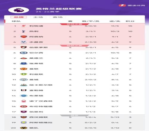 利物浦五战全胜仍高居榜首,水晶宫赛季不败已经来到第四。