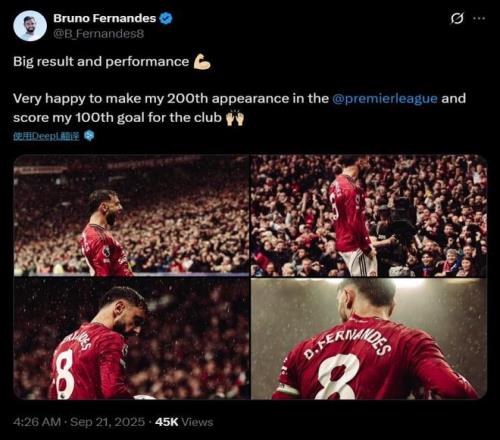 赛后,B费拿到了MVP奖励发文庆祝胜利并配文:重要的结果和表现!很高兴达成个人英超200场和曼联100球。