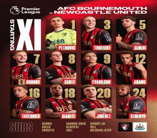 直播吧9月21日宣 北京时间今天21点,英超第5轮比赛,伯恩茅斯主场对阵纽卡,两队公布了此役的首发阵容。