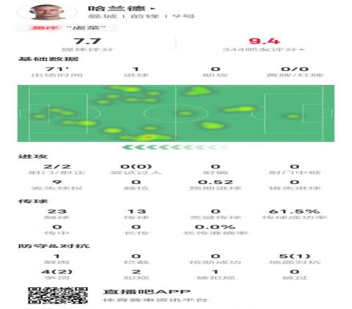 技术统计数据显示,哈兰德本场比赛两射两正打进1球,9次丢失球权,另外他有1次解围,5次地面对抗成功1次,4次争顶成功两次,获评7.7分。