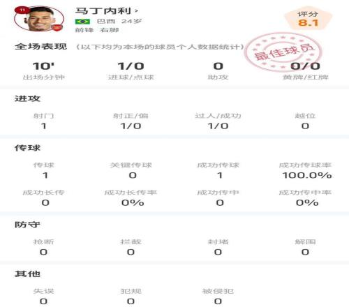 雷速体育9月22日宣 英超第5轮,阿森纳坐镇主场1-1战平曼城,马丁内利替补登场并帮助枪手打进绝平进球。