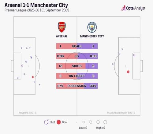 北京时间9月22日凌晨,英超第5轮,瓜迪奥拉率领的曼城在客场与阿森纳战成1比1平。单看结果可能没什么感觉,但如果看了这张图的话呢……