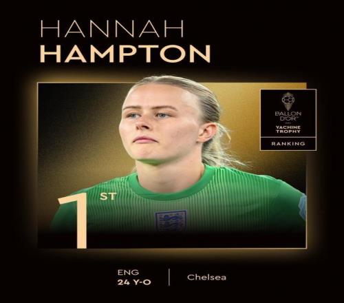 直播吧9月23日宣 金球奖官方消息,切尔西、英格兰女足的汉普顿获得2025年女足雅辛奖。