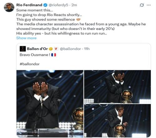 雷速体育9月23日宣 英超名宿费迪南德在社媒转发了金球奖官方发布的登贝莱获奖动态,并配文赞赏了今年的金球奖得主。