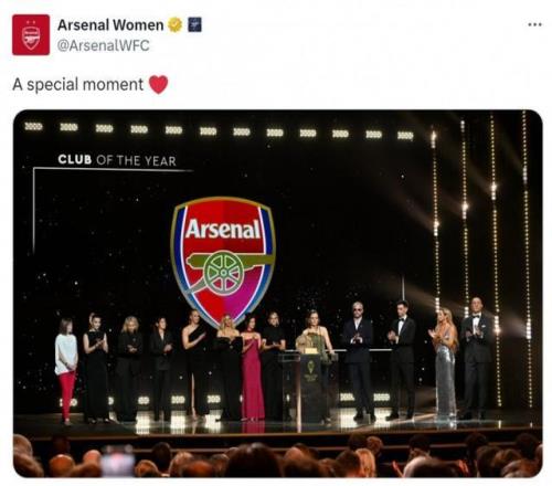 阿森纳女足官方社媒晒出领奖照片,配文:“一个特别的时刻。”