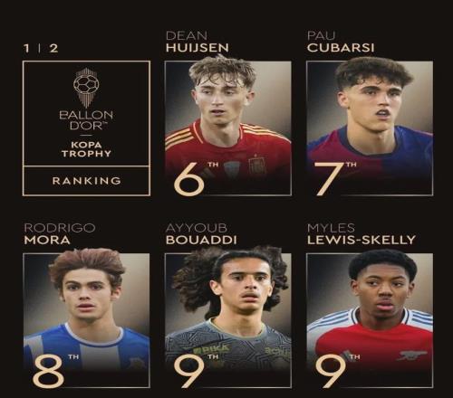 前五名分别是:亚马尔、杜埃、若奥-内维斯、埃斯特旺、伊尔迪斯。