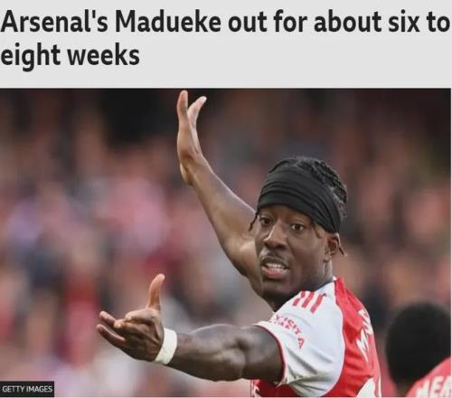 BBC记者SM发文,阿森纳预计马杜埃凯将因为膝伤缺阵6-8周,但万幸这名边锋被认为并没有伤及膝盖十字韧带。