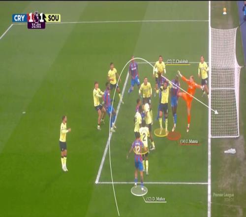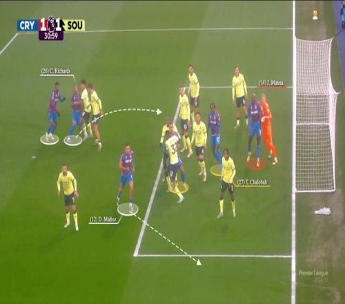 水晶宫的站位相对传统:禁区外有三名球员负责防反击(蒂里克-米切尔未入镜),跑位球员包括理查兹、莱尔马和穆尼奥斯(白色),特雷沃-查洛巴和拉克鲁瓦是主要目标点(黄色),而马特塔则站在门将身前(红色)。
