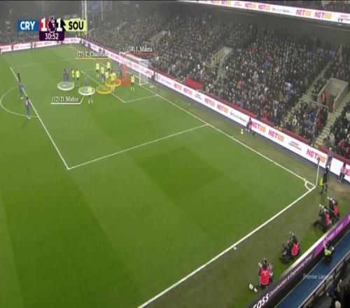 通过这种方式,水晶宫清空了后点,让格伊可以自由跑动,因为沃顿挡住了他的盯防者迪乌夫。