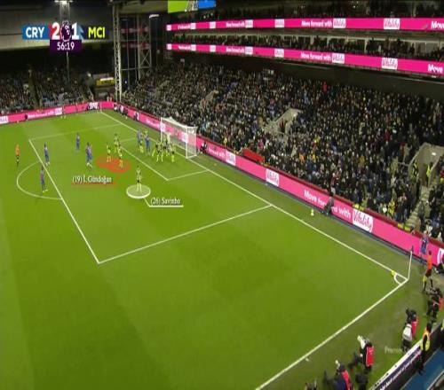 这样一来,沃顿精准地将球传入了空出的区域。同时,理查兹(黄色)摆脱了京多安的盯防,并迅速攻入该区域,打入了水晶宫本场比赛的第二粒进球。