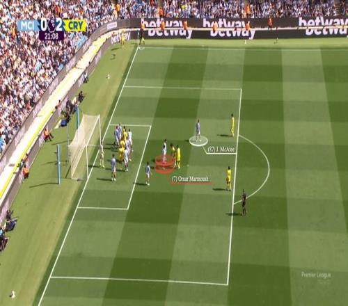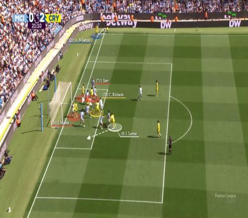 沃顿瞄准前点区域的传中得到了马特塔、穆尼奥斯和伊斯梅拉-萨尔(红色)的配合。水晶宫的中锋马特塔牵制住了埃德森,而穆尼奥斯和萨尔则挡住了德布劳内与科瓦契奇,这两人正是前点的第一道防线。