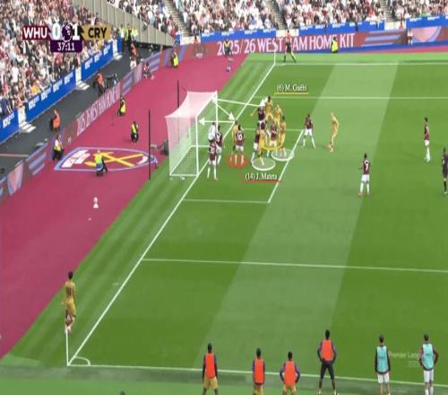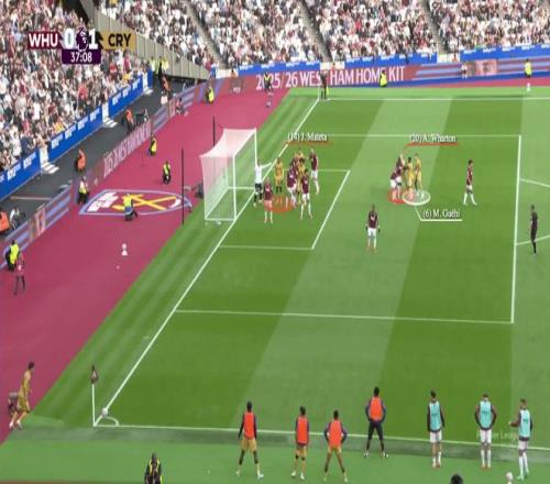 马特塔的挡拆作用是为水晶宫中后卫创造空间的关键解决方案之一,而球队六名进攻球员在禁区内的站位则是另一重要因素。