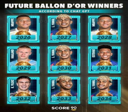 直播吧9月24日宣 Score90列出ChatGPT对未来几年金球奖获奖者名单,其中9年中亚马尔占4席,具体如下: