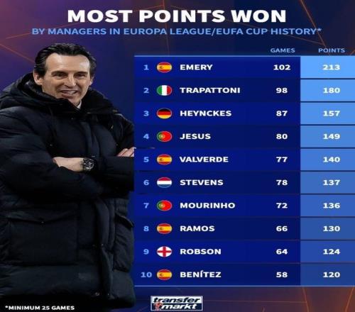 直播吧9月25日宣 德转盘点了欧联杯历史上主帅赢得积分最多纪录,其中埃梅里居首,本赛季执教维拉的他是否能夺得个人第五座欧联杯冠军值得期待。以下为具体榜单: