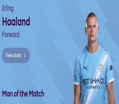 本场比赛哈兰德打进2球,并有1次助攻,赛后他也当选英超官方球迷票选全场最佳球员。