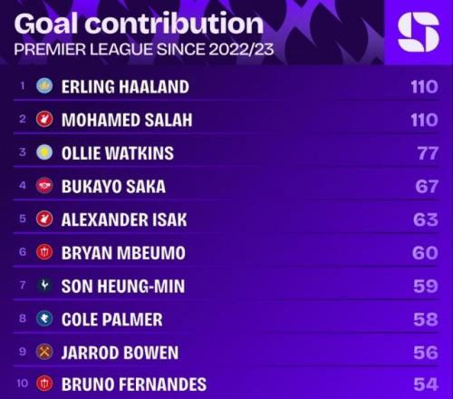 据Squawka的数据统计,自哈兰德加盟曼城以来,他已经在英超联赛直接参与110粒进球,同期没有哪名球员比他更多,只有萨拉赫同样参与110粒进球与他持平。