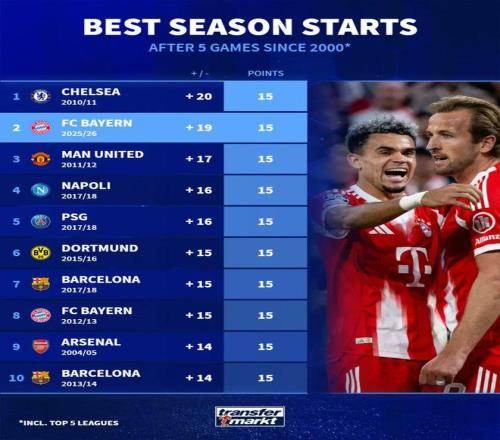 拜仁本赛季德甲前五轮全胜,净胜球为+19,这是自2000年以来五大联赛赛季前五轮第二好开局。