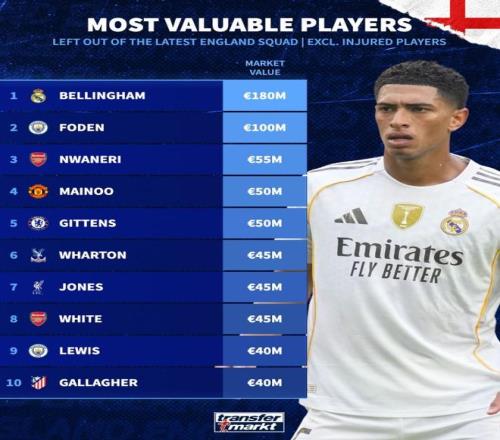 英格兰队公布了最新一期球队大名单,德转盘点了本次未能入选的球员身价榜(受伤球员除外)。