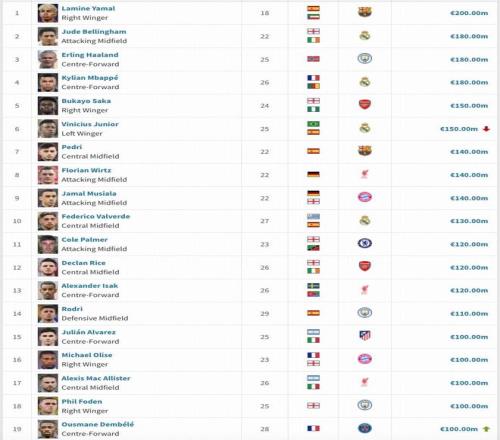 随着登贝莱身价登上1亿欧,在德国转会市场身价榜上,目前有19名球员身价过亿,五大联赛中仅意甲没有球员上榜。德甲身价将在10月14日更新,英超身价在10月17日更新。