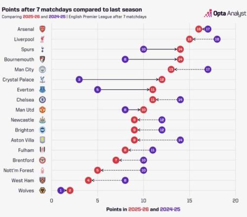 Opta列出了本赛季英超球队与上赛季前7轮过后的积分对比,阿森纳少拿了1分,利物浦少拿了3分,水晶宫多拿了9分进步最大,曼联则多拿了2分。