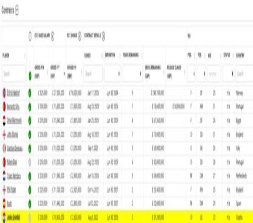 名字 | 年龄 | 国籍 | 合同还剩几年 | 周薪(万英镑 / 万元)