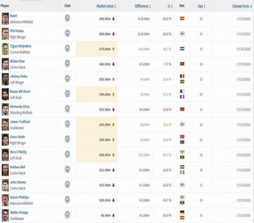 北京时间10月17日,德转市场更新了最新一期的英超球员身价。曼城队中罗德里和福登身价均下跌2000万欧元。