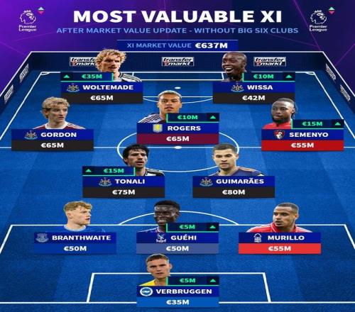 在更新了英超球员身价后,德国转会市场网站列出了英超非BIG6最贵阵容,沃尔特马德领衔纽卡5人入选。