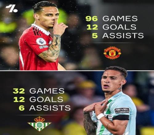 安东尼为皇家贝蒂斯各项赛事已出场32次,贡献了12粒进球和送出6次助攻,已直接参与18粒进球,超过了曼联生涯96场的数据。