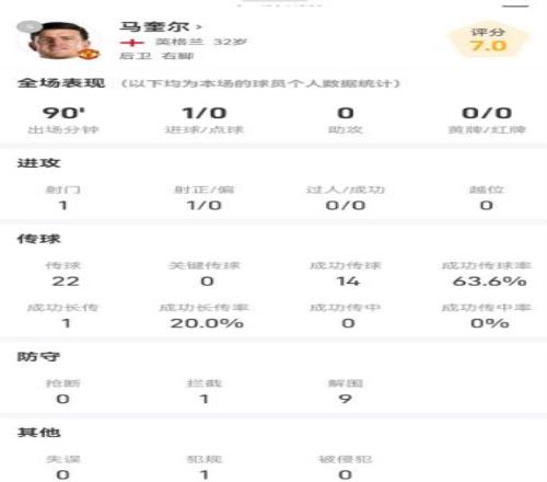 作为球队的后卫,马奎尔在进攻端闪耀的同时,没有忘记自己的本职工作。马奎尔在场上有着1次拦截和9次解围,多次化解对手的进攻,这同样显得非常难能可贵。