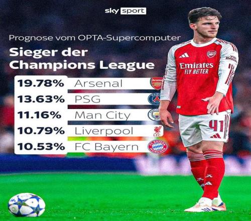 北京时间10月21日,Opta的超级计算机预测了目前欧冠夺冠概率最高的5支球队,阿森纳以19.78%高居第一,卫冕冠军巴黎圣日耳曼排名第二,曼城排名第三。